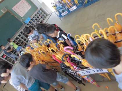 道徳で,机やロッカーの中など,身の回りの片づけについて話し合いました。整理整頓をすると「気持ちがいい」,「どこに物があるかすぐに分かる」,「安全にもつながる」などの意見がでました。早速,自分たちの机の中やロッカーを確かめました。その後,靴箱に行き,靴を揃えたり,置き傘を置きなおしたりしました。子どもたちは,自分のものだけでなく,他のクラスや学年のお友だちの傘なども整えてくれていました。