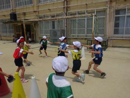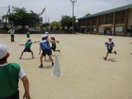 バトンパスやコーナーの曲がり方を工夫しながら学習を進めています。