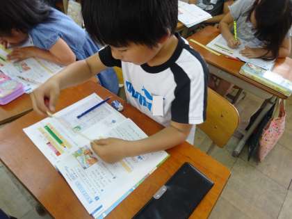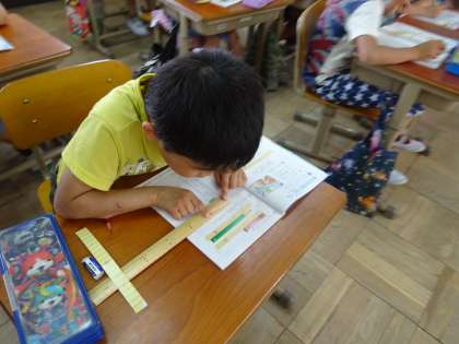 1時間目の学習では,身の回りにあるもの(鉛筆・消しゴム等)を使って,○こ分かを確認しました。2時間目以降は,竹尺を使って長さを読んでいます。cmは理解できたのですが,mmが難しいようで,はかる練習をして,cmやmmの量感をもてるよう指導しています。