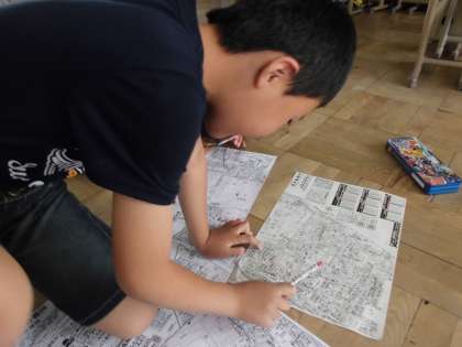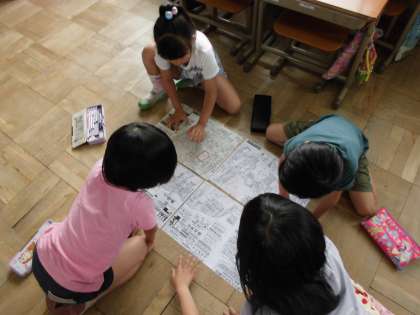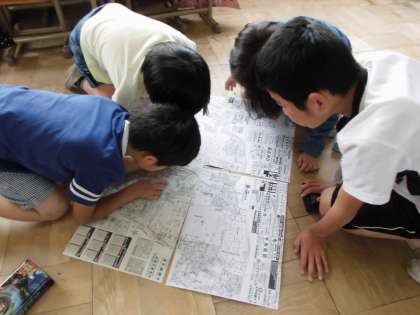 みんな地図に頭寄せて,一生懸命好きな場所やお店を地図から探しています。