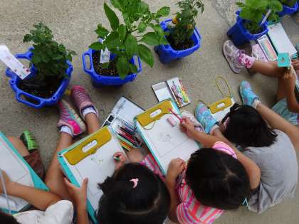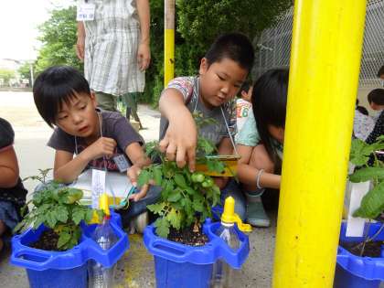 生活科で育てている「小さな仲間たち」と「野菜」を観察して記録しました。におい・手触り・大きさ・色・聞こえる音等,観察しているものによく近づいて,よく見て,記録しました。「触覚がぴょこぴょこ動くねん。」「葉っぱは僕の手でグーを作ったぐらいの大きさだ。」と,しっかりと観察している声がたくさん聞こえてきました。