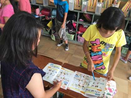 簡単な自己紹介を考え、友だちと交流しました。英語を使いながら、「自分のできること」を交流してみると、友だちの違った側面も見えてきます。