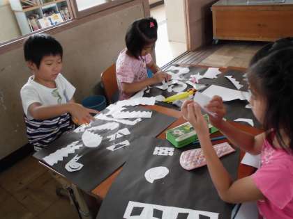 ハサミで切った偶然の形から,何に見えるかを見立てて,画用紙に貼りつける学習をしました。