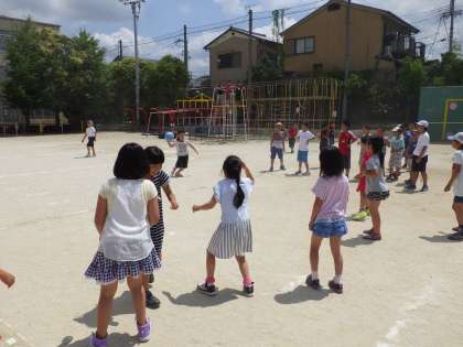 4年生のボールをキャッチしてがんばる3年生。