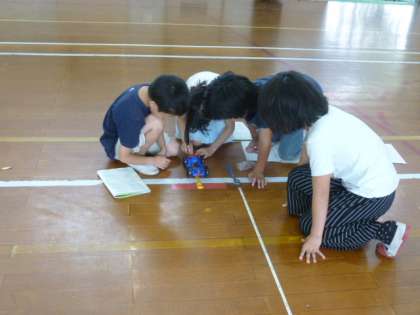 体育館で,ゴムを伸ばす長さを変えて,どのように車が走るのかを調べました。