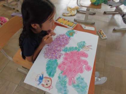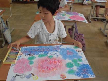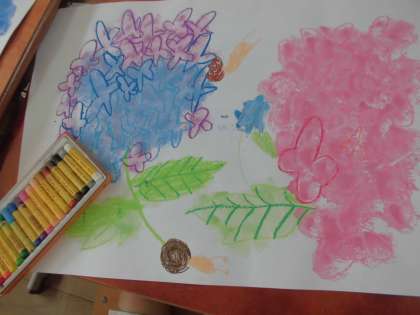 先日かいたアジサイの花に,今日は,クレヨンでカタツムリと自分の姿を描き加えました。楽しい絵が仕上がりました。