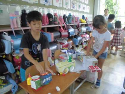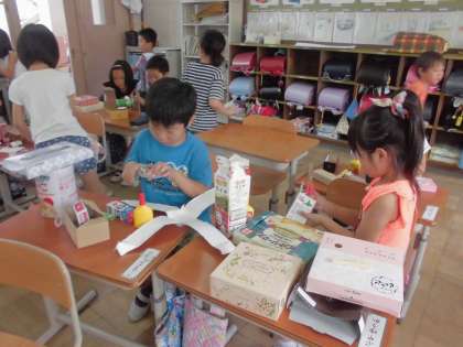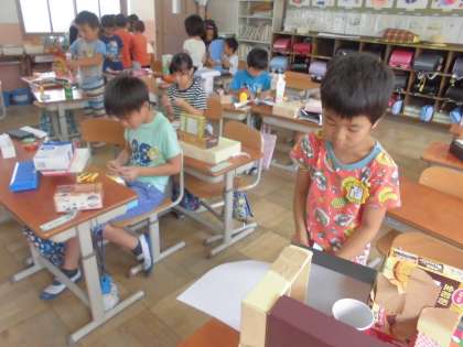 箱を組み合わせると何に見えるかな?箱をどんどん並べたり,積んだり,つないだりしながら,自分の作りたいものを見つけて作りました。