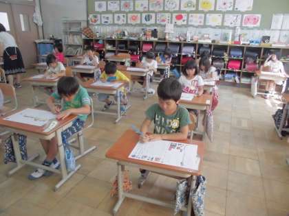 夏休み前の学習のまとめをしています。テストの時は,机の上には鉛筆と消しゴムだけを用意する,テスト用紙を配られたらまず名前を書く,時間いっぱい見直しをする等,テストの受け方も上手になりました。みんな真剣に取り組んでいます。