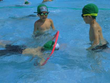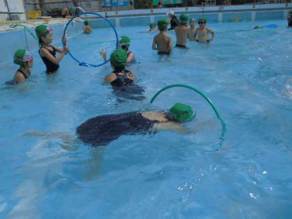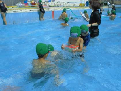 「もぐる」ことをめあてにした「モグモグコース」の様子です。水中でフープを通り抜けたり,碁石を拾ったりしました。水遊びを始めた頃は,顔を水につけることが苦手だった子も,今日はフープを上手にくぐることができて,大満足の様子でした。頑張りましたね。