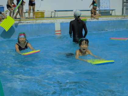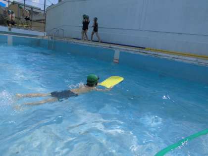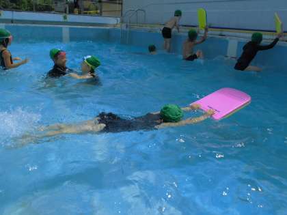 「泳ぐ」ことをめあてにした「スイスイコース」の様子です。両腕,両足をしっかり伸ばし,きれいなフォームです。今年の水遊びで,どの子も自分の課題を見つけてしっかり取り組むことができました。