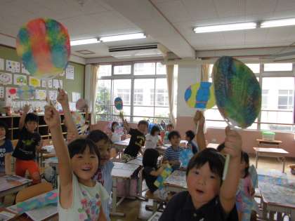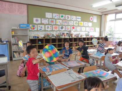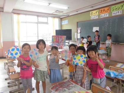 きれいに染まった和紙を今度はうちわにはります。和紙にしわが入らないようにピンと伸ばしながら丁寧にはり,はさみで形を整えて,できあがり!!みんな世界に一つしかない,素敵なうちわができました!
