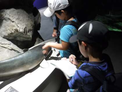 ナマズの模型を観察しています。