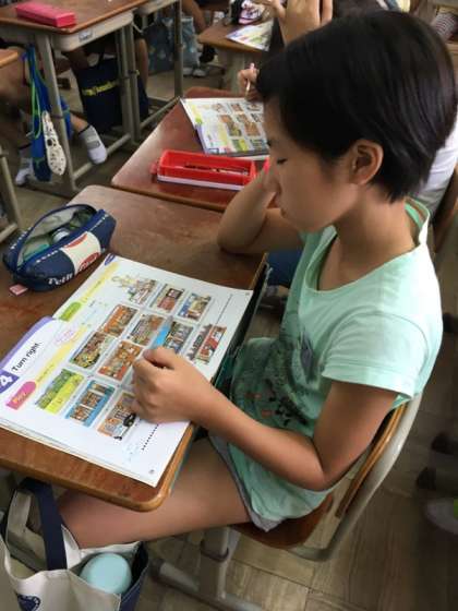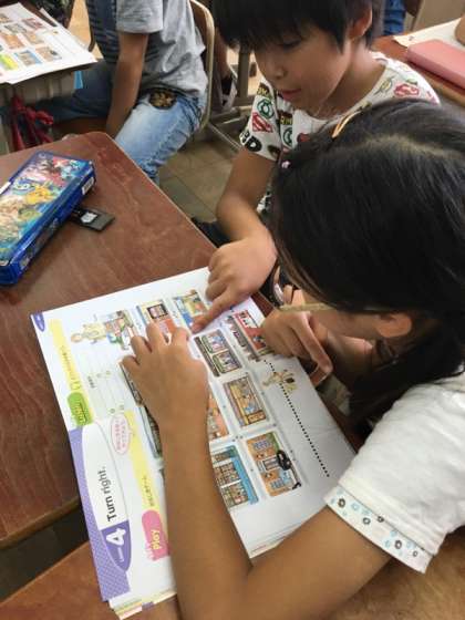 英語を使って町にある建物を言ったり、進み方を英語を使って表現したりしました。「コンビニエンスストア」って、発音が違うんだ!