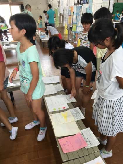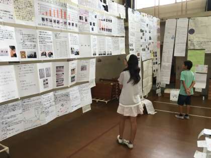 体育館に展示されている自由研究の作品展を見に行ってきました。すべての学年の作品を食い入るように見ています。