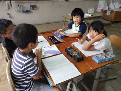1年生に藤ノ森小学校のことをもっとよく知ってもらうための発表を考えています。グループで司会者を中心に上手に話し合いを進めています。