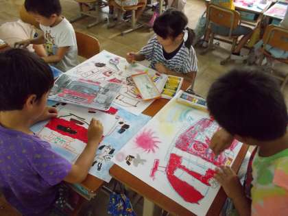夏休み前に,消防士さんが来てくださった時に描いた消防車の絵です。