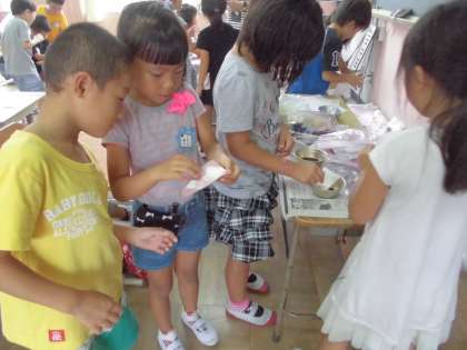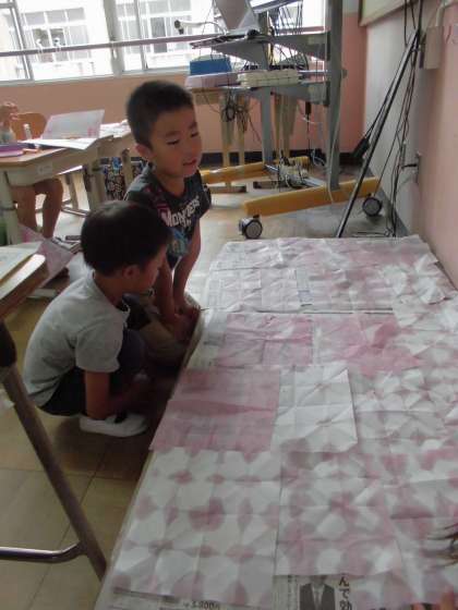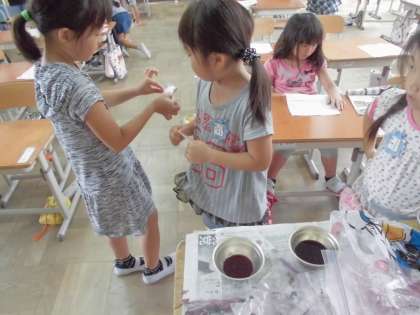 1年生が大切に育ててきたアサガオ。夏休み中に収穫した花で色水をつくり,和紙に絵を描いたり,染めたりしました。