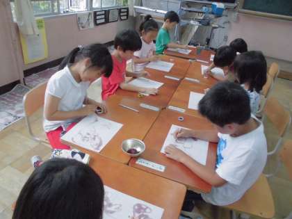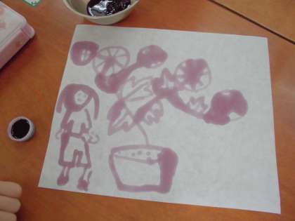 めん棒に色水をつけて,自分たちが育てたアサガオの絵を描きました。花だけでなく,水やりをしたり,花に囲まれた自分の姿を描く子どももいました。とても素敵な絵ができあがりました。