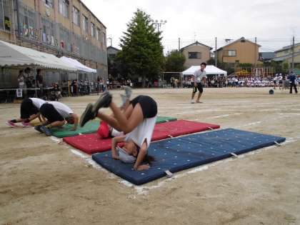 3年生のアイデア走は,スタートで前転,ハードルを跳んでボールをついて走ります。
