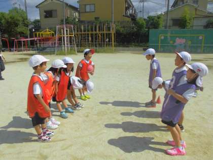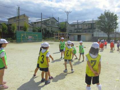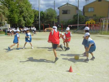 外野チームがボールを転がすのが上手になってきたので,内野チームも今まで以上にワクワクしながら,ボールの行方に集中して逃げることができています。振り返りでは,「相手の足をねらってボールを転がすといいと分かりました。」,「正確に相手にボールを当てるには,足や体を相手に向けるといいと思います。」などの感想が出ていました。