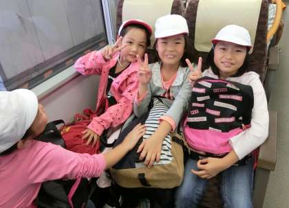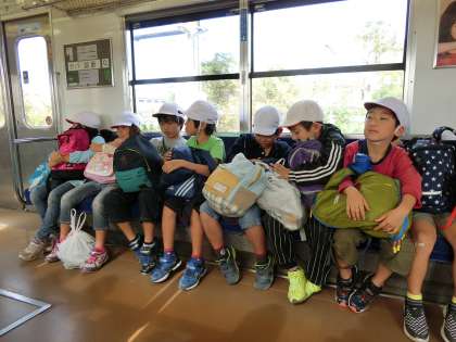電車内では,公共の施設を使うので,約束やきまりを守ることをめあてとして乗りました。他の人が乗ってきたら,さり気なく席を譲ろうとして立ちあがっている子もいました。中国やアメリカ,イタリア等の,外国の方々に話しかけられて,楽しそうに会話している子もいました。言葉がわからなくても,楽しい時間を過ごしている子どもたちに驚きました。素敵な経験をしました。
