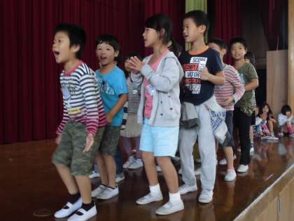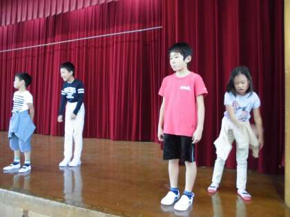 声や動きの工夫を考えて,クラスごとに見せ合いをしました。
