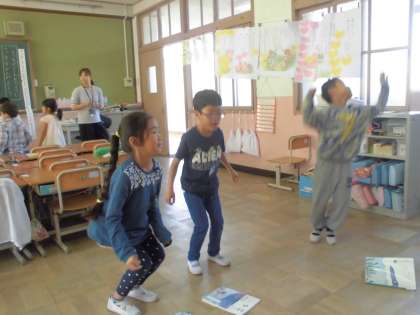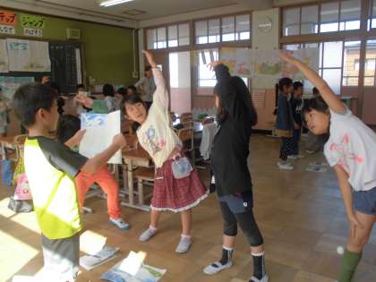 くじらぐもの場面の様子が分かるように,動きを考えました。「天まで とどけ 1,2,3。」のところは,おもいっきりジャンプをしたり,体育の授業で体操をしている様子をあらわしたり,グループで工夫をしていました。