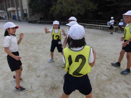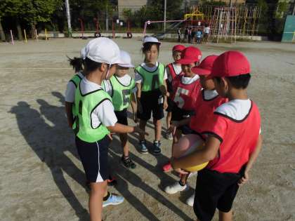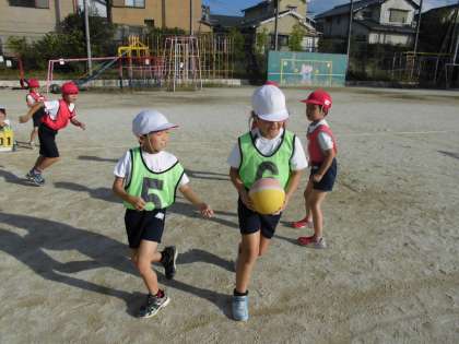 どうすればパスがもらえるか,どうすればパスが出せるか,そんなことも考えながら動きます。ついついボールばかり見て,うまくパスが回らないこともありますが,みんなとても楽しそうにボールを追いかけています。