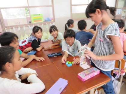 牛乳パックの中に,ペットボトルのキャップがいくつ入れられているのかな?「How many caps ?」と聞くと「nine」「eight」と答えていました。