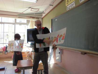自己紹介の後は,「はらぺこあおむし」の絵本を読んでいただきました。あおむしが食べた「リンゴ」や「すもも」,「なし」などが英語では何というのかをしっかりと聞きとることができました。また,「オレンジ」や「チーズ」「ソーセージ」なども,日本語とはアクセントが違うことなどに気づくことができました。
