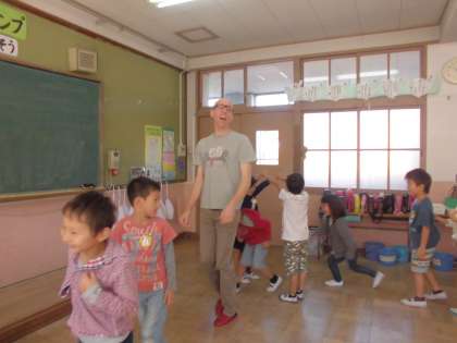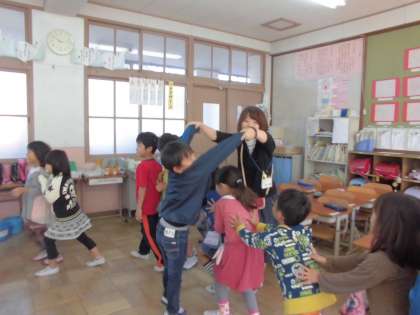 「ロンドン橋」の歌が歌えるようになると,次は歌を歌いながらゲームをしました。橋役の子どもが“falling down”のところでお友だちをつかまえるゲームです。みんなドキドキしながら橋をくぐっていました。