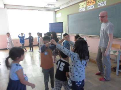 「頭,肩,ひざ」の歌のあとは,子どもたちもよく知っている「ロンドン橋」の歌を歌いました。