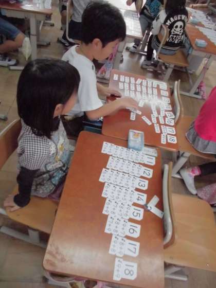 今日の算数科では,たしざんの計算カードを並べて,その並び方を考えました。同じ答えのカードを比べてみたり,カードを横に見てみると,いろいろな規則性を発見することができました。
