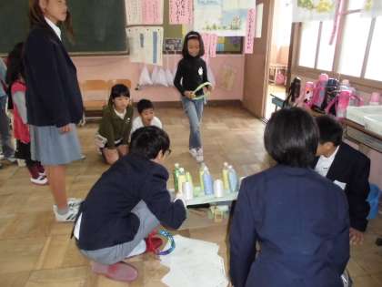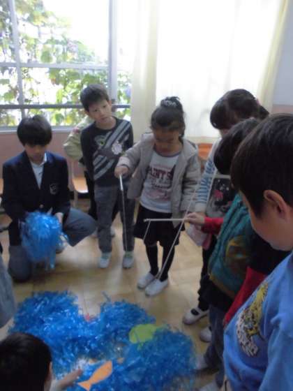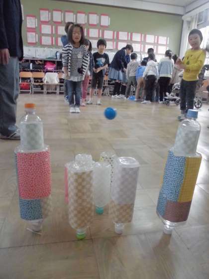 お兄さん,お姉さんの手作りのゲームが始まりました。魚釣りゲームに,ペットボトルボーリング,缶積みなど,どれも工夫をこらしたゲームばかりで,少し緊張気味の1年生もすっかりお兄さん,お姉さんに打ち解けた様子です。