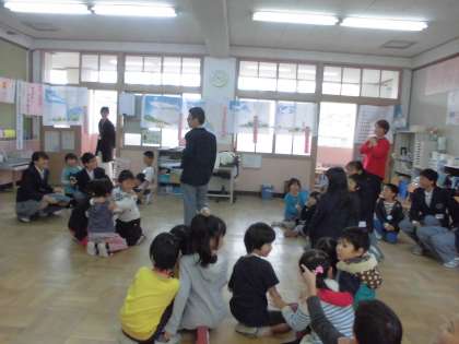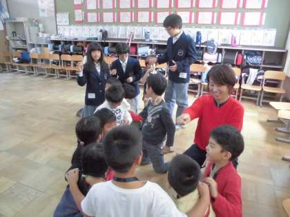 グループごとに手作りゲームで遊んだ後は,クラス全体で「猛獣狩りに行こうよ」のゲームをしました。「猛獣がりに行こうよ!猛獣狩りに行こうよ!」と歌いながら,指定された人数のグループを作っていきます。中学生のお兄さん,お姉さんも一緒に参加して場を盛り上げてくれました。