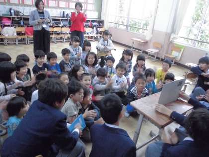 最後は紙芝居を読んでもらいました。かなりの時間,絵本や紙芝居を読んでもらいましたが,「え〜!もうおしまい!?」と,お話が終わった後は残念そうな子どもたち。お礼を言って,さようならをしました。