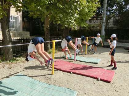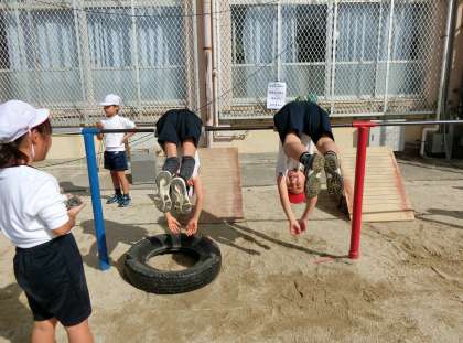 はじめは鉄棒が苦手で緊張していた子どもたちも,だんだん笑顔が見られるようになってきました。写真下は,ふとんほし3人娘です。