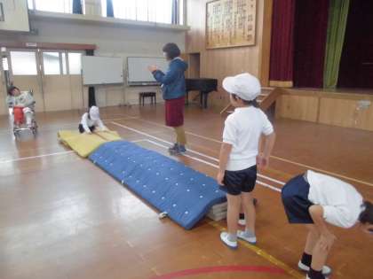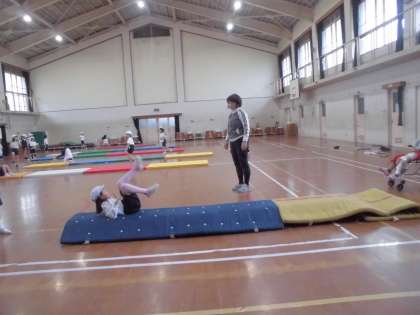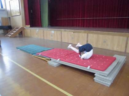 今日のめあては「自分のできる技を繰り返してやろう」です。普通のマット,細いマット,斜めになっているマットなど,いろいろな場で挑戦しました。