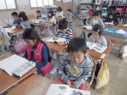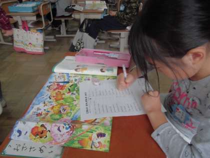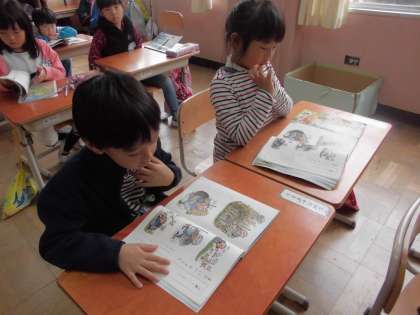 今日は,日本の昔話を教科書の絵の中から探しました。「いっすんぼうしだ!」「かぐや姫だ!」と,子どもたちは,自分の知っている昔話を絵をヒントに見つけていきます。その後,「まのいいりょうし」というお話を聞きました。昔話の最初が「むかし,むかし」から始まること,終わりは「これで,いちごさけた。(=めでたし,めでたし。)」で終わることなどを,お話の中から見つけました。これから,昔話をたくさん読んでいこうと思います。