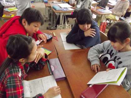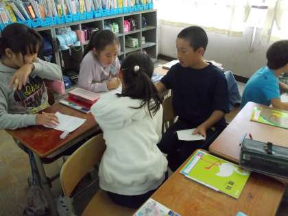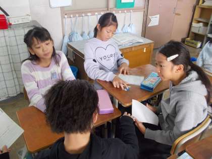 まずは、班の人同士で、考えた作品を発表しあいます。