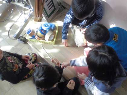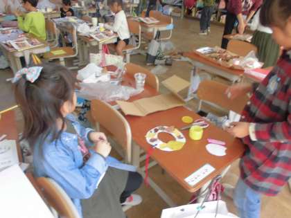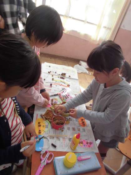 製作をすすめる中,「これ,どうしたらいいのかな?」「ちょっとここ,持っててあげようか。」など,友だちと相談し合ったり,協力したりするほほえましい場面もあちこちで見られました。さあ,どんな素敵な作品が仕上がるか,楽しみです。お家から紙コップやリボンなど,たくさん準備していただき,ありがとうございます。