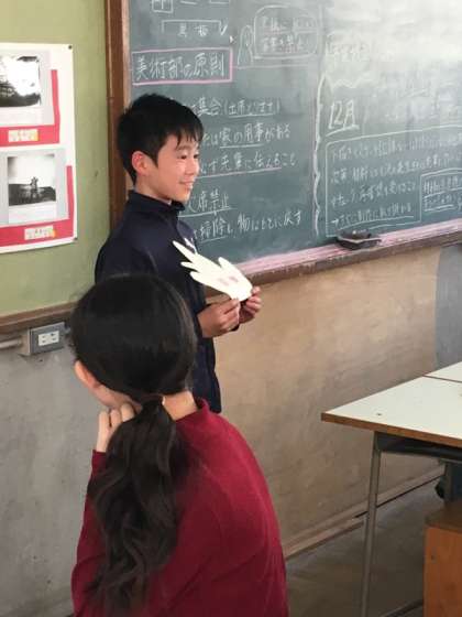 出来上がった作品を披露します。どのような作品になったのか、思いを交流していきます。何かを創り出す活動は、時間が足りないことが多いのですが、時間内に仕上げることも大切です。今後の図画工作でも同じように頑張っていきたいですね。