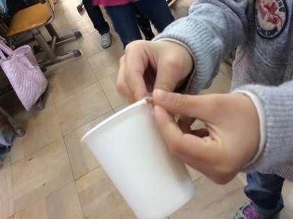 おもちゃの作り方や使い方について,わかりやすく伝えるカードができるよう,作り方を一つ一つ確認しながら作っています。