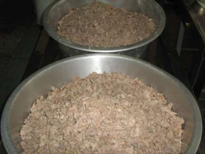 給食では、先に肉をいためて引きあげ、次に野菜をいためたところに再び肉を