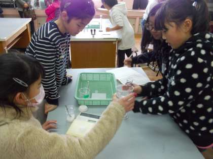 「ミョウバンは水に限りなくとけるのか。」という問いについて、自分たちで実験をしながら、考察を導き出します。
