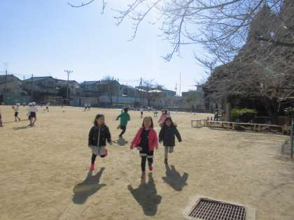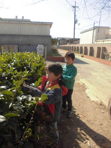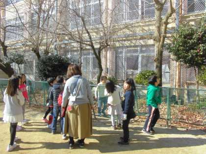 冬を見つけに校庭にやってきました。「バケツに氷がはってる!」「これ,ツバキっていう花なんや・・・きれいやなあ。」「木に葉っぱがついてないなあ・・・。」など,たくさんの冬を見つけることができました。