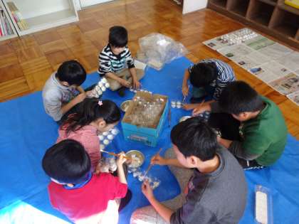 青くぬった壁紙(模造紙)を段ボールに貼ったり