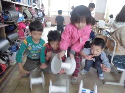 図工科の学習で,紙皿を使って作品を作っています。紙皿の形を利用して,ころがるおもちゃを作ります。紙コップやペーパーの芯,空き箱などを接着剤や紙テープで紙皿に張り付けて土台の出来上がり。貼りつけるだけなのですがこれがなかなか難しいのです。皆,慎重に根気強く黙々と取り組んでいました。接着剤が乾くのを待って,転がしてみると・・・・コロコロコロコロ,進んでいきます。嬉しくて何回も何回も転がす姿が見られました。さあ,次は,飾り付けです。どんな飾りをつけようかな。次の図工の時間が待ち遠しいです。