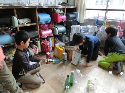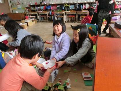 1年生を「ガラクタしょう店がい」に招待するために,集めた廃材を使って,あそびを考えました。今回は友だちとやりあって,良いところを見つけ合いました。お互いの遊びを交流して,とても楽しそうに活動していました。