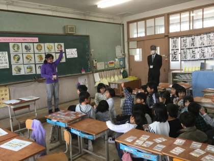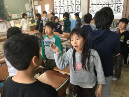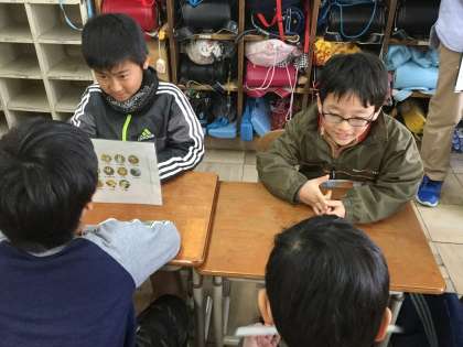 この日を楽しみにしていたようで,真剣勝負!といったように自信をもってクイズを出しました。答える方も真剣です。クイズに正解すると動物のカードをGET。お互い楽しみながら英語でコミュニケーションをとっていました。